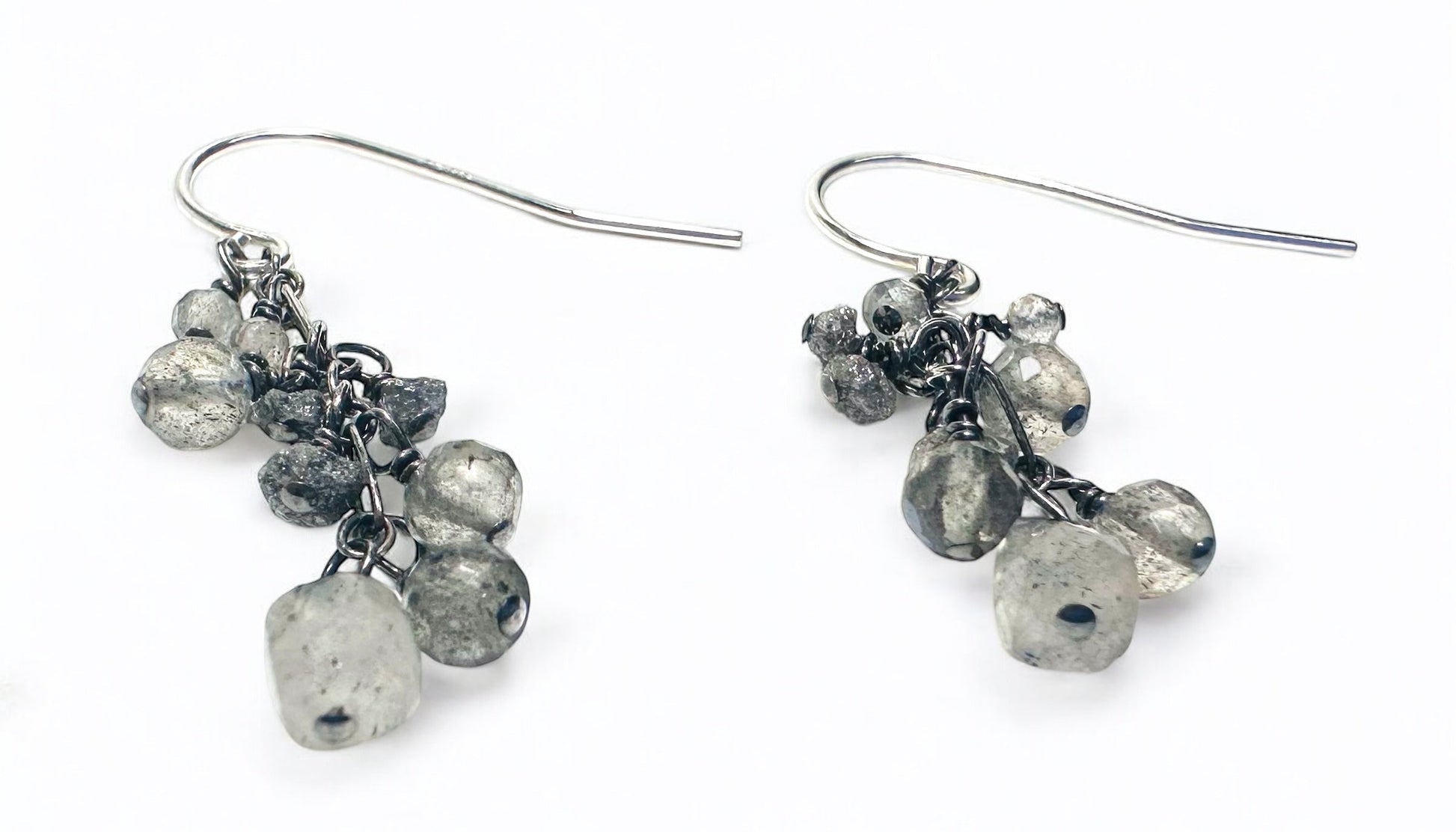 Dainty Sterling Silver chain and tiny Moonstone grey and square beads with tiny chain. Sterling silver ear wires.
