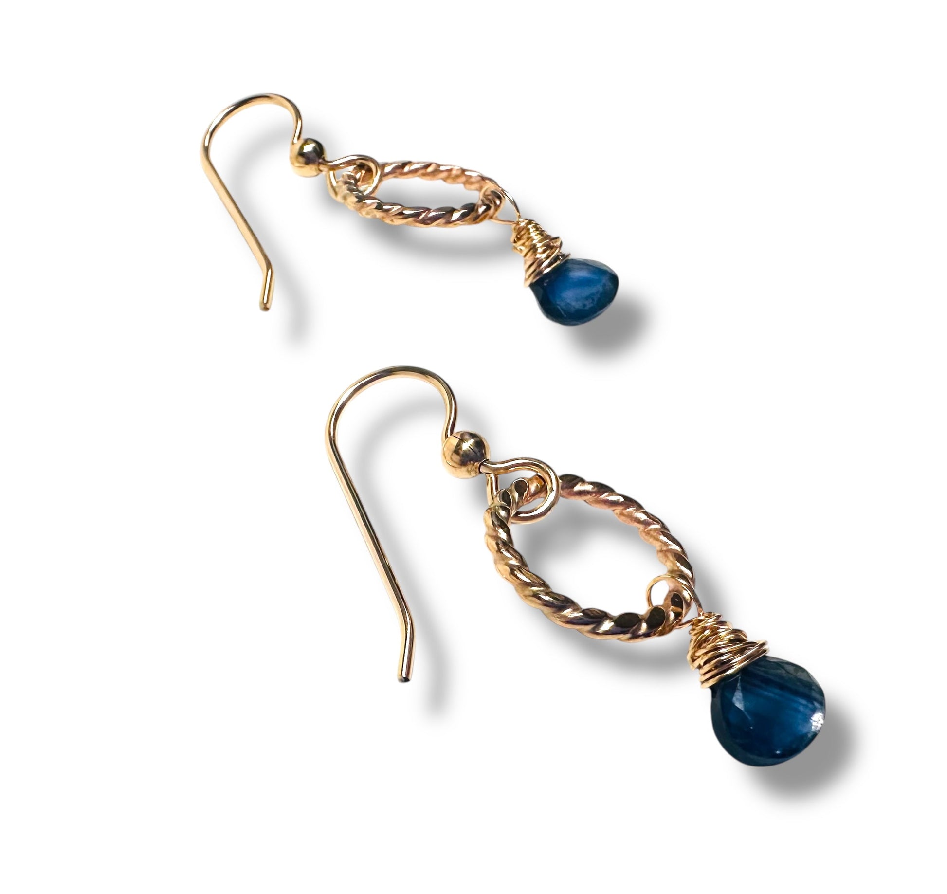 1.25” long. These gorgeous golden earrings feature a sturdy twist circle charm with a dainty genuine kyanite teardrop bead. Wire wrapped with gold filled wire over silver.