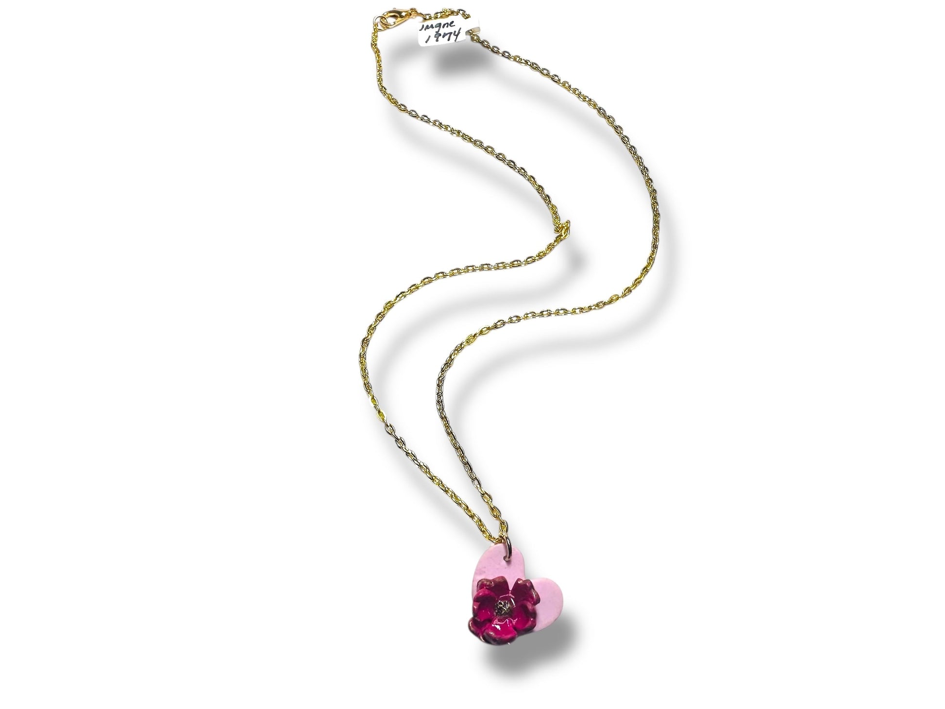 18” long gold plated chain. Lightweight sculpted flower made with polymer clay. About 3/4” long heart charm with poppy flower attached.