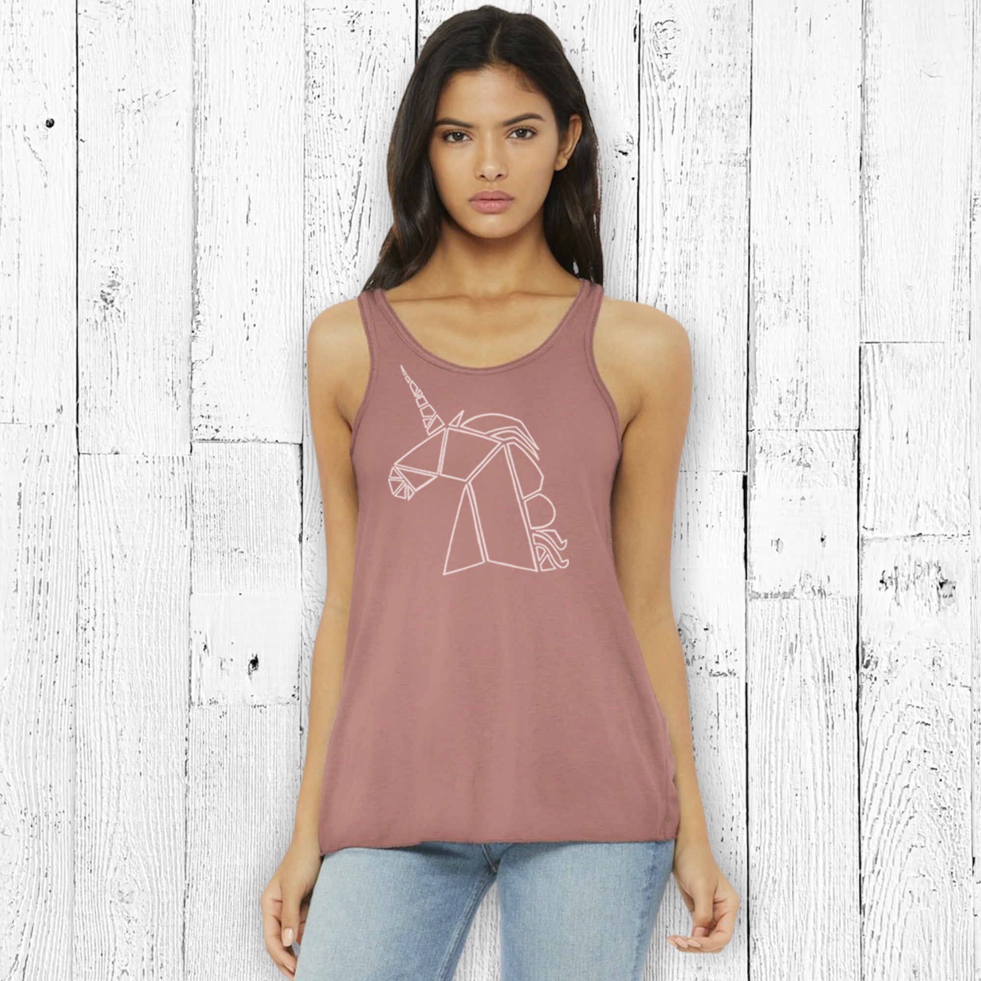 The Unicorn Flowy Tank Top by artist Eujin Kim Neilan features an enchanting unicorn design that embodies a celebration of the mythical unicorn's magic and a reminder to embrace your own uniqueness, believe in your inner magic, and celebrate the extraordinary qualities that make you one-of-a-kind. This women's racerback tank top combines whimsical style with empowering self-acceptance.